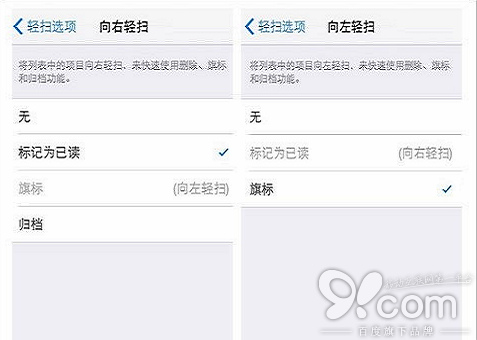 如上圖你可以在這裡給向左輕掃手勢指定“標記為已讀”、“旗標”的任務,在向右輕掃手勢中用戶可以選擇“無”、“標記為已讀”、“旗標”以及“歸檔”。