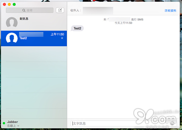 之後就是 Handoff 的訊息同步測試時間,先試一試傳送,直接打開訊息應用程序,在新訊息之中輸入任何電話號碼,然後輸入訊息,再按 Enter 傳送,就可以利用手機傳送。至於收到的任何的任何訊息,就可以透過 iPhone 在 Mac 之中收發。