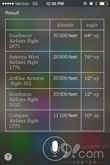 問問Siri“What flights are above me?”(我上頭飛過什麼飛機?)或是說“Planes overhead”(上頭的飛機),然後它就會給你很詳細資料,包括飛機名稱、高度、飛行角度。(Siri需要30秒才能整理出這個資料,請有耐心一些。)