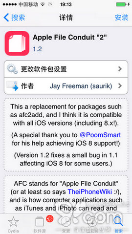 注意,Cydia內置源中就有afc2add補丁,只是它的名字早已被更改為Apple File Conduit “2”,大部分用戶在剛越獄後都找不到Apple File Conduit “2”,原因是Cydia內置源中還未加載入插件與補丁。