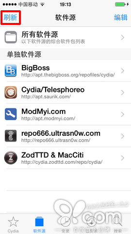 打開Cydia,依次點擊【軟件源】—>【編輯】—>【添加】—>輸入源地址http://apt.91.com—>點擊【添加源】→等待數據自動加載更新→點擊【回到Cydia】