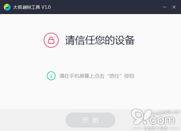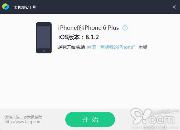 3.越獄工具自動識別後,如下圖所示,會提醒您關閉“查找我的iPhone”功能,如果你確認已關閉,可忽視該提示文字。點擊按鈕【開始】。