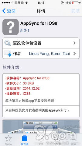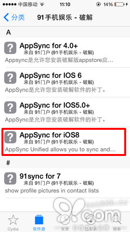 添加完源地址後,直接進入91源內安裝appsync補丁,具體操作步驟:點擊進入91源,分別進入【破解】分類中找到【AppSync for iOS8】,點擊右上角的【安裝】按鈕,再點擊右上角【確認】,Cydia就會自動安裝好appsync補丁,安裝好後,請務必重啟下設備使其生效。
