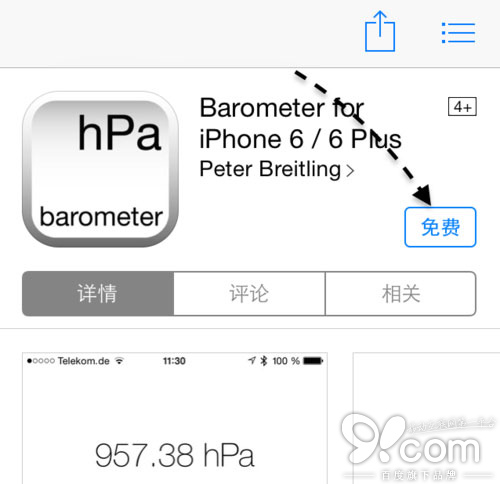 如果當前已經有了蘋果 iPhone6 的小伙伴,想要檢驗一下“氣壓計”的效果,可以前往 App Store 下載 Barometer for iPhone 6 / 6 Plus 這個應用軟件。當然你也可以直接在手機上打開這個網址