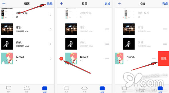 第二步:點擊相簿視圖右上角的「編輯」按鈕。此時設備上所有可以刪除的相簿左側將會露出一個紅色的警示圖標。