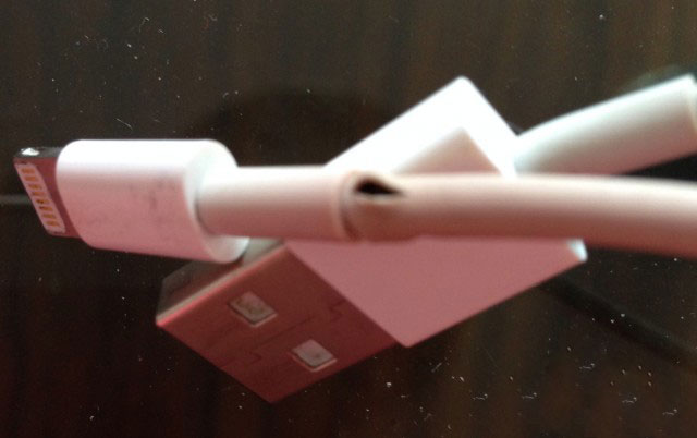 筆者有一條 iPad 原配的 Lightning to USB 線纜的橡膠外皮破掉了,大概就像下圖所示(原諒我當時沒有拍照,這張圖片來自網絡搜索),此前筆者並不知道有這等免費換線好事,這次知道有這個政策之後,趕緊去了上海比較大的 Hong Kong Plaza 店。