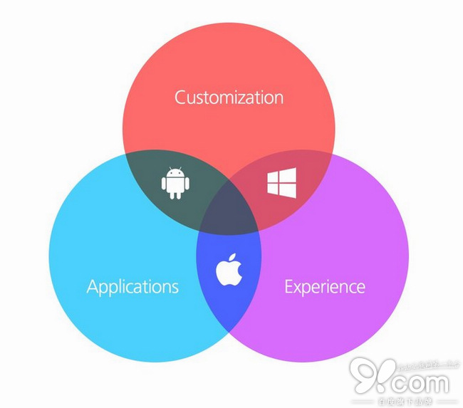 Jay 還畫了一張示意圖來展示三大手機操作系統的特點。蘋果的優勢在於流暢的體驗和海量的應用,安卓的優勢則在於開源和高度可定制化,微軟的優勢在於流暢的體驗。而蘋果此次發布會中,也開始考慮可定制化的問題了。