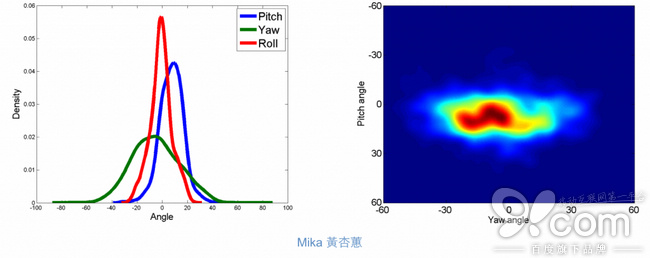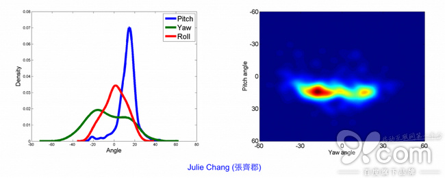 三位美女的自拍照中,絕大部分的 Pitch 也是臉朝下約 15 度左右的角度,而 Julie Chang 的 Yaw 則沒有一個絕對的准則,雖然習慣性是以右臉看相機,但左臉也絕不缺乏,而橫擺的角度約 20 度左右。可是,左還是右臉,就要看看大家對鏡子練習的成果了。至於 Roll 方面,三位美女都沒有太明顯的變化,不過 Julie Chang 有時候則有較大的 Roll 角度。