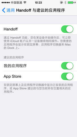 通用設置的改動相對較大,「Handoff 與建議的應用程序」(以下簡稱 Handoff )是一個新出現的子菜單,頂替在了原來「輔助功能」菜單的位置,而後者被挪至下方獨立顯示。點開 Handoff 菜單,發現已從此前版本的一個開關增加至現在的三個,並且開關下面都有詳細的解釋,用戶可以更好的選擇哪些需要打開,哪些需要關閉。