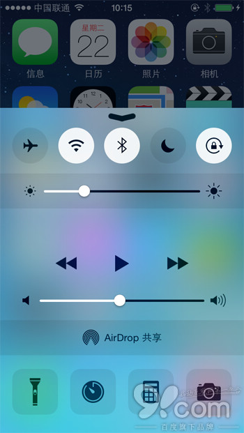主屏幕看完了,筆者無意間劃出了「控制中心」,這一下可又著實震驚了一下,外觀改動很大,將每個部分的白色分割線,全部改成了一個一個顏色深淺不同的色塊,看起來更有沖擊力,點擊按鈕的時候對比度也會更高,可是如果已經習慣了原來那個風格的話,這種新的風格,還需要一定的時間去習慣。