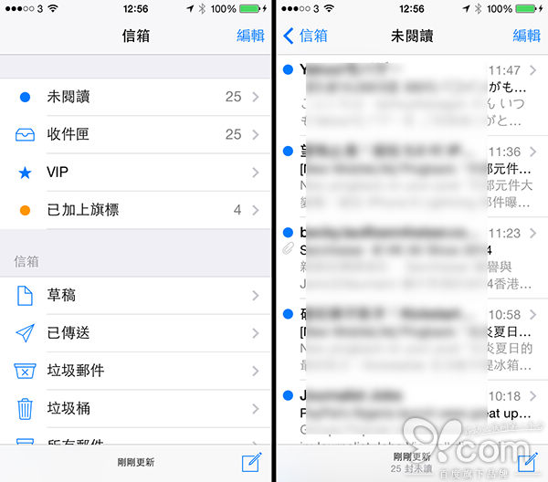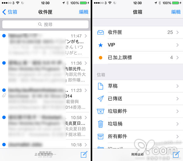 首先你的郵件 App 一定要登入了電郵帳號,否則不能使用,進入之後,如果是 iPhone 的話,應該會看到郵件清單,iPad 的用戶應該會在左面看到郵件清單。在左上角按郵箱,來到郵箱清單,之後會在上方看到收件箱、VIP 以及「已加上旗標」三個收件箱。