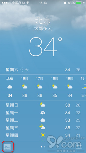 iOS 8內置的天氣應用程序,從界面上來看貌似沒有什麼變化,但稍加仔細觀察就會發現,首先左下角的天氣供應商發生了變化,由原來的 Yahoo Weather 改為了現在的The Weather Channel,蘋果官方的說明是後者會對每個地區有更好的服務支持。