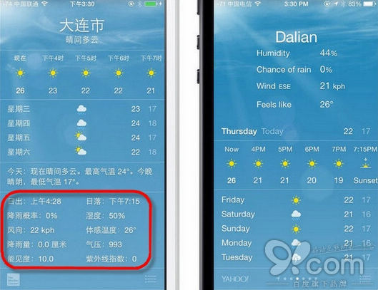 另外,在主界面中向下滑動還可以看到更加細節的數據(在iOS 7中只能看到濕度、降雨概率、風速和體感溫度)。iOS 8在前述四項的基礎之上,還新增了日出日落時間、降雨量、氣壓、能見度和紫外線指數。這樣我們就能更直觀的看到每天的天氣情況了。