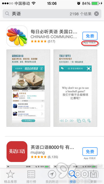 另外,當我們自行輸入某個App關鍵詞後,會在預覽界面裡即有更詳細的介紹,比如說“App內購買”或者是某一個專題推薦過之類的信息,都會寫在下載按鈕的下面。這樣會更方便我們選擇下載。