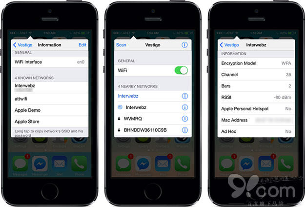 Vestigo可以讓你在任何位置任何頁面,通過activator手勢,快速從狀態欄呼出wifi管理菜單,你可快速查看周邊wifi信號並快速選擇你中意的信號,同時可以強制刷新wifi與查看每個wifi詳細信息(強度,加密方式,mac地址,AP模式等等)。