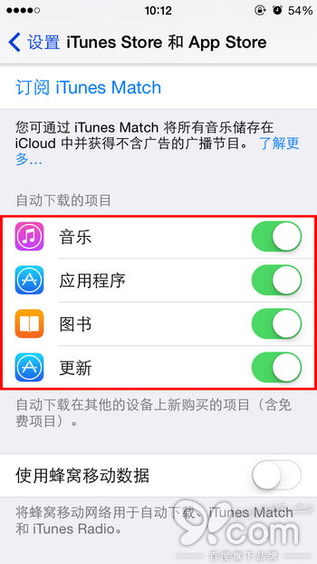 注:如果你不想使用你的蜂窩網絡來「自動下載」,請確保「使用蜂窩數據」的選項開關保持關閉狀態。這樣一來,「自動下載」只會在你在連接到無線局域網時進行。