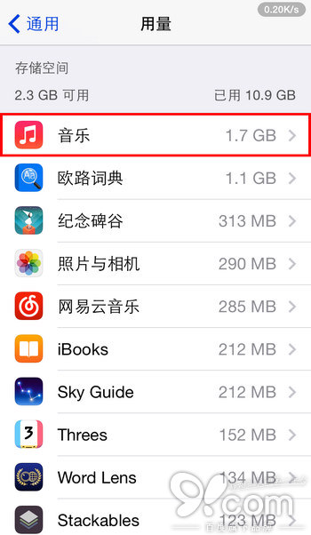 在此界面列出了你設備上各項內容所占的磁盤空間,並按照從大到小的順序排列。