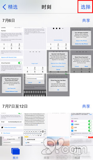 第二步:點擊該頁面右上角的「選擇」按鈕,然後你會看見該頁面所有具體時刻(如 7 月 6 日)右邊的「共享」按鈕全部變成了「選擇」按鈕。