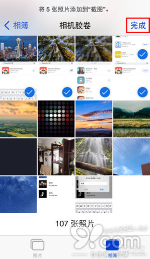 第五步:返回到「相機膠卷」文件夾視圖,手指輕輕點擊所有需要添加到「截圖」相簿的照片,接著點擊右上角的「完成」確認添加。
