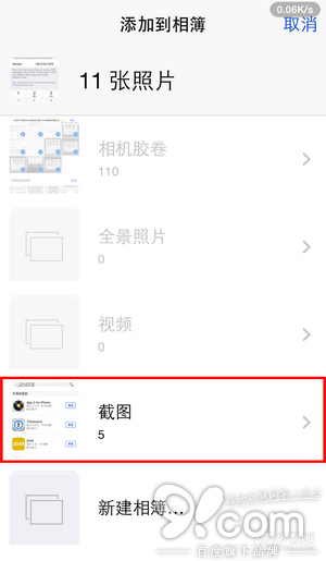第五步:選擇「添加到」的目標相簿(本例子中我們還是選擇「截圖」相簿)。