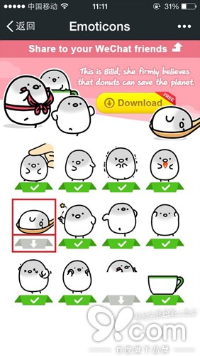 打開網頁後,表情圖的下方都有個↓下載圖標,直接點擊要下載的GIF表情,它就會自動下載安裝,已下載安裝好的表情會變成打勾。下載完成之後的表情位於微信表情選項卡的第三個“笑臉(收藏)”按鈕中,你就可以使用萌萌的新表情啦。