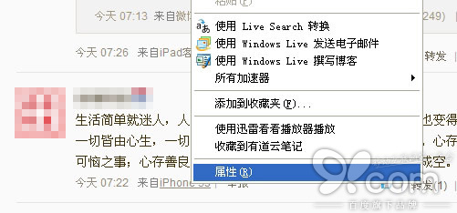 3.在眾多微博裡,選擇一條你喜歡的小尾巴(也可以參考文末提供的字符),右鍵點擊,選擇【屬性】
