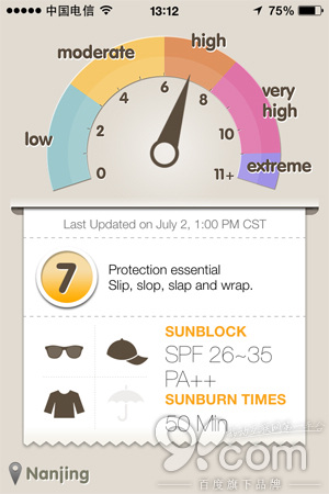 除了給出紫外線強度之外,UVmeter 還會根據當前強度給出防曬建議,例如在筆者當前所在地南京市,UVmeter 給出的紫外線指數為 7 級,而在下方則給出防曬 SPF 值和 PA 值,即希望采用 SPF 指數在 26 - 35 之間的防曬用品,而 PA 值則推薦達到 PA + + 級別的防曬品,即使用可延長曬效果 4 至 8 倍時間的防曬品。