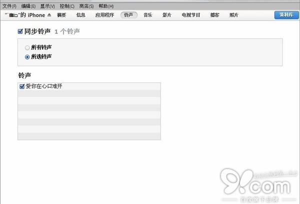 第八步,將iPhone與電腦相連,選擇iPhone管理頁面的“鈴聲”選項卡,選擇剛剛制作的鈴聲,點擊“應用”進行同步,即可將該鈴聲同步到iPhone上。