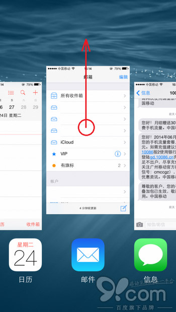 雙擊Home鍵,即可進入後台應用管理界面,向上滑動卡片,即可關閉相對應的應用。這裡最多可以使用三根手指,同時關閉三個應用。