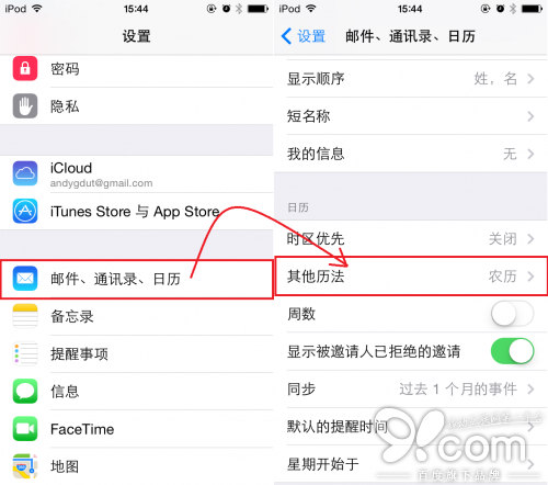 第一步,在“設置”中打開“郵件、通訊錄、日歷”,向下一直拉到日歷設置的部分,點擊“其他歷法”。