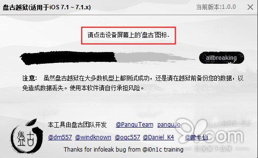 4.直到當設備提示“請點擊設備屏幕上的'盤古'圖標”時,拿起你 的iOS設備,點擊屏幕上的盤古圖標。