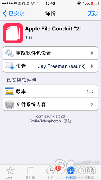 提示:如果搜索不到Apple File Conduit“2”,可以進入Cydia—【變更】—點擊左上角【刷新】—再搜索該插件。