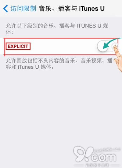 第五步,在“音樂、播客與iTunes U”選項頁面,關閉“EXPLICIT”功能,即可隱藏指定的音頻文件。