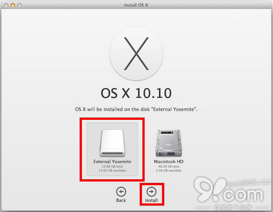 第三步:選擇該外部磁盤( External Yosemite ),點擊“安裝”按鈕,需要時輸入你的管理員名稱和密碼。