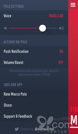 Marco Polo 提供了幾種不同的自定義選項。首先,你可以挑選它回應你的聲音(有 30 種不同的“ Polo ”聲音可供選擇);其次如果你不想喊“ Marco ”,你還可以改變你想喊出的詞語,筆者覺得需要與眾不同一點(不然剛好別人的 iPhone 回應了你,多尴尬)。遺憾的是,它只能回應你“ Polo ”。
