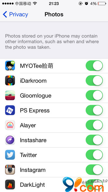 如果關閉某個應用程序對照片的訪問,它將不可以進行讀取、存儲照片等操作,若是其運行時需要進行上述操作時, iOS 將彈出請求對話框提醒用戶該應用程序的行為,並提出備選方案(如何更改)。