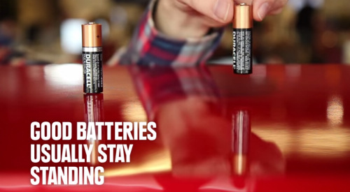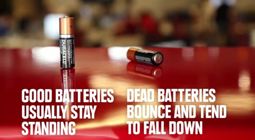 把電池立在桌上,稍微拿起來,離開桌面一點點,然後放手!這時有電的電池掉下來後會持續站著;沒電的電池就會倒下去,超神奇!