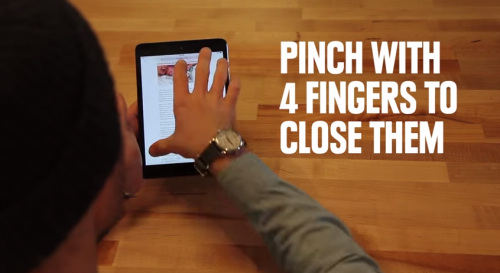 (這招限 iPad 和 iPad mini 使用)通常關閉 app 時,我們都會按圓圓的 HOME 鍵,但只要你用的是 iPad 家族,用手指一抓,就可以回到桌面了!另外四指網上一拉,就可以叫出多任務列,幾乎是用不到 HOME 鍵了呀!