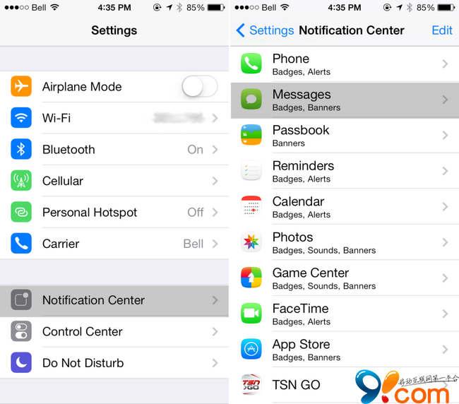 第二步:點選通知中心;向下滾動找到並點擊“信息”