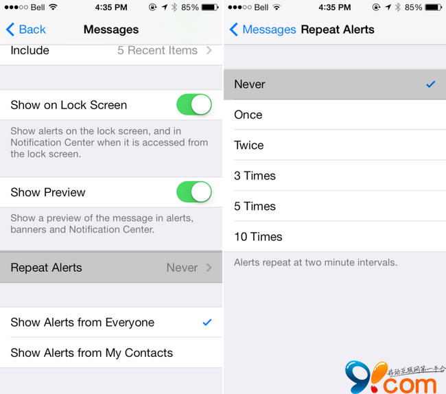 當您的iPhone , iPad或iPod touch 收到iMessage或信息的時候,並不是任何時刻都方便讀取的。你可能暫時就忽略它,因為沒什麼大不了的——後續你可以在通知中心看到記錄。然而有個比較惱人的特性就是,蘋果默認在 iOS 設備設置了重復提醒(間隔為兩分鐘)。