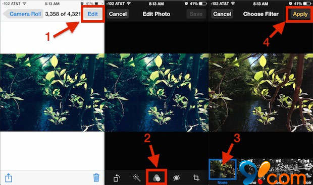 iOS7中的濾鏡功能可以繪制一些不錯的風格化效果照片,擁有一種獨特的外觀效果,但如果你決定你不再想照片擁有濾鏡效果,實際上可以很容易地從畫面中移除濾鏡效果,並將其恢復到原來的樣子。