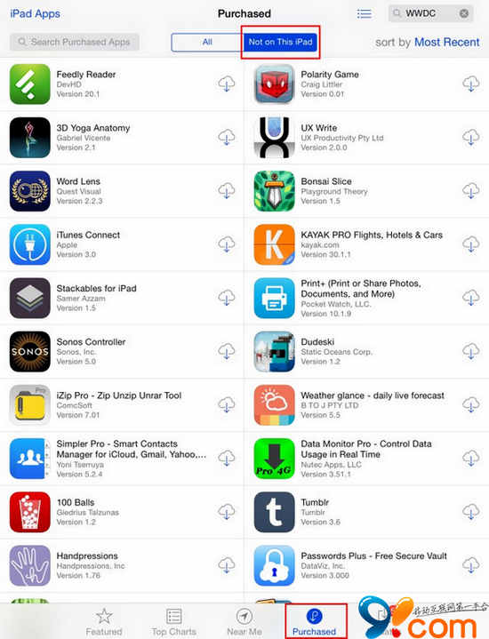 iPad 上面界面稍有不同,“已購買”選項卡已經單獨設置成 App Store 的選項卡了。直接選擇該選項卡,然後輕點“不在此 iPad 上”選項卡即可(如圖):