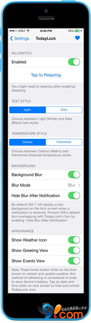 安裝完成後進入設置,你可對【TodayLock】進行設置,你可以啟用/禁用背景模糊、隱藏通知,設置天氣圖標、天氣詳情顯示等。