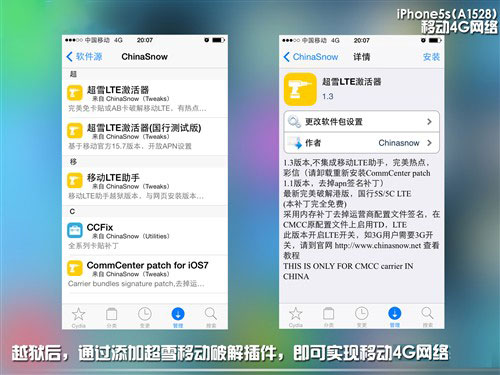 以上三個步驟基本上就是目前所有的已知iPhone5s A1528破解使用移動4G的方法,由於官方版本限制,即便我們成功使用移動4G依舊會有一些小問題,比如使用4G上網時可能會造成通話限制,即有時出現撥不通的情況,需要關閉4G選項,或用“流量儀”輔助才可使用。終歸一句話,A1528的移動4G網絡來之不宜,且用且珍惜。