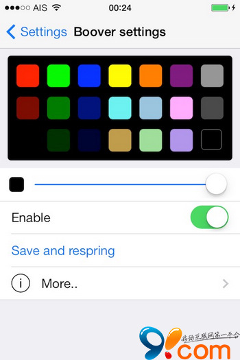 打開「colors」,可以設定顏色(以RGB為設定單位),下方可以設定為以App 色調各自搭配顏色。同樣記得「Save and Respring」。