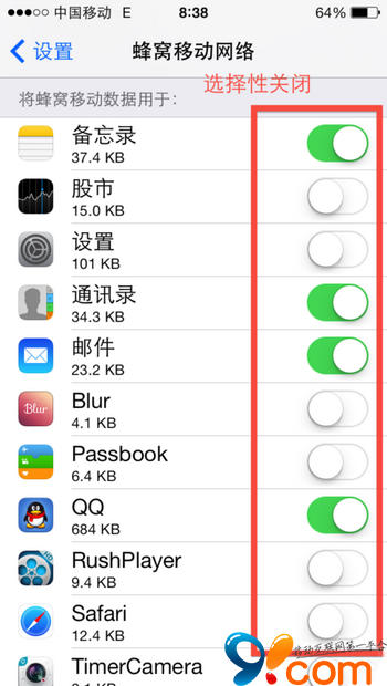 在“設置”-“蜂窩移動網絡”下關閉一部分實際並不需要蜂窩網網絡應用程序的開關