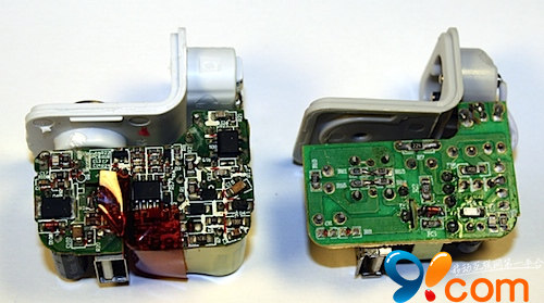 據悉,Shirriff此次比對的則是一款從Ebay上買來的盜版iPad充電器(只需要3美元)和iPad官方充電器(需要19美元)。光從外形來看的話,人們很難分辨出真假,但把它們打開之後卻非常好區分(見下圖)。