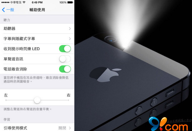 開啟方法:「設定/設置」→「一般/通用」→「輔助使用」→「聽力:收到提示時閃爍 LED」。