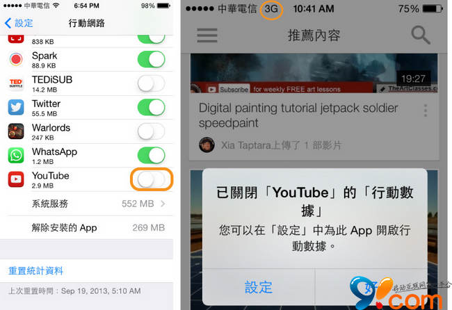 尤其是用 Youtube 看影片,或是 Facebook 動態時報上的影片播放都很容易讓流量爆表,可以利用移動數據限制,讓父母在外使用 3G 時不會誤失流量。(當然也要教導他們不要亂下載過大的文件)