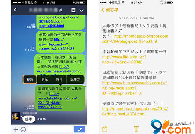 你可以教他們用「備忘錄」管理這些連結,很簡單,只是「復制」→「粘貼」,就可以讓他們在任何時後細細回味這些珍藏。(別小看這個功能,他真的能幫父母解決很多問題,同時增進他們的社交便利性)